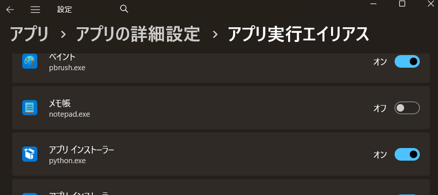 設定→アプリ→アプリの詳細設定→アプリ実行エイリアス