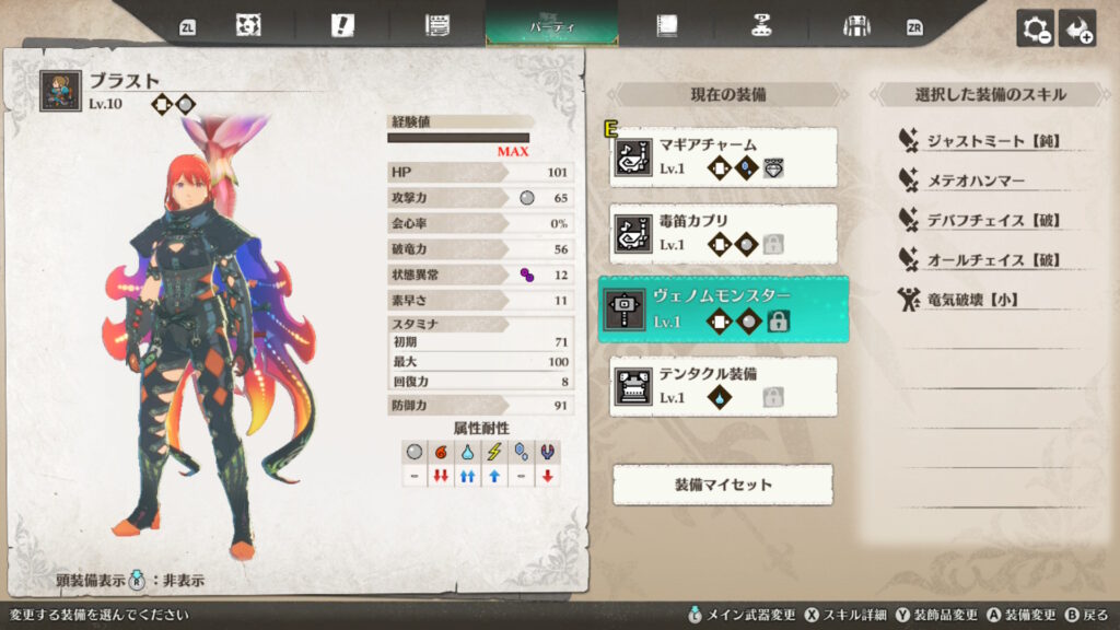 防具はスタミナ消費が厳しいためネロミェール防具を採用。