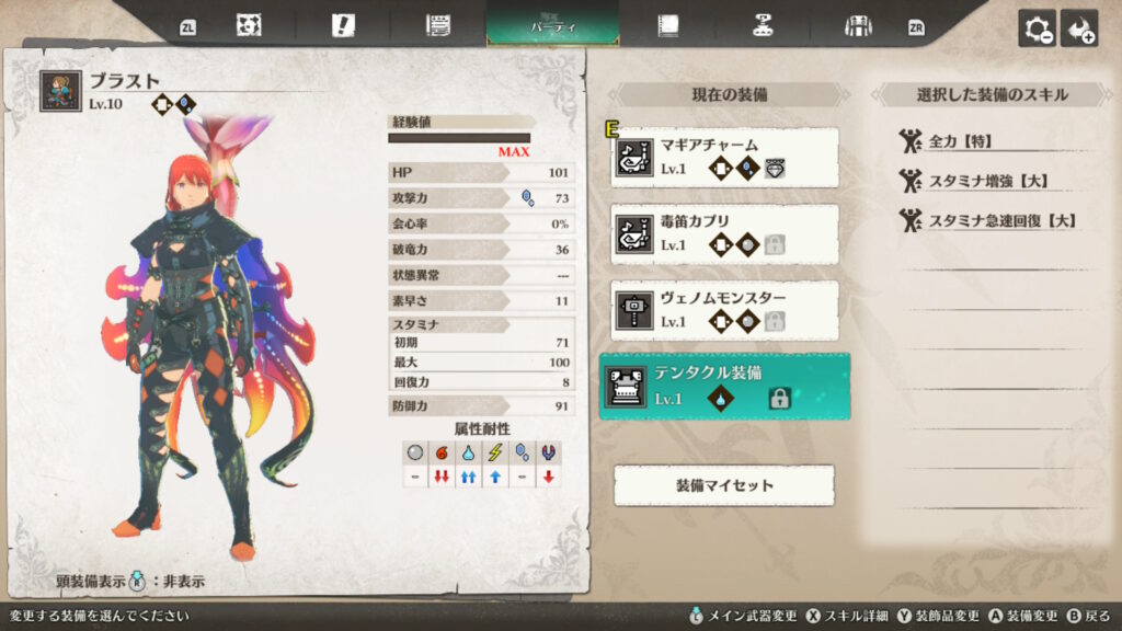体験版でもネロミェールが出現するので、テンタクル装備を作って防御力とスタミナを確保します。